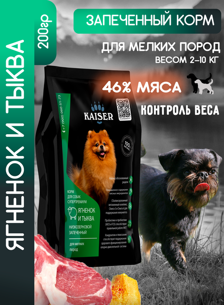 Корм с ягненком и тыквой был разработан специально для здоровья и активного долголетия собак. Упаковка 200г. Рекомендован собакам склонным к набору лишнего веса, стерилизованным собакам и собакам старше 7 лет. Мы добавили в корм доказано работающие добавки: 1. карнитин способствует снижению веса питомца за счет сжигания жиров, улучшает работу сердца и сосудов, питание мозга питомца кислородом, важно для тучных и старых животных 2. таурин - естественный метаболик способствующий улучшению энергетических и обменных процессов в организме, поддержанию функций клеточных мембран, защищает печень, регулирует углеводный и жировой обмен 3. DL метионин проявляет детоксицирующее, регенерирующее, антиоксидантное и нейропротекторное воздействие. Полностью натуральный продукт Лаборатория правильных кормов «Kaiser» — это собственное производство и тщательный контроль качества на всех этапах: от сырья до доставки готового продукта. Для изготовления сбалансированного сухого корма для собак, мы используем сертифицированное сырье уровня холистик. Наш принцип — эволюционно естественное питание для зверей; мы не используем искусственные красители и ароматизаторы. При создании этого корма мы вдохновлялись естественным рационом животных и сосредоточились на подборе идеального состава сухого корма для собак, учитывающего все особенности организма собак мелких и карликовых пород. Сбалансированный сухой корм для собак от нашей лаборатории учитывает все факторы жизни Вашего питомца в условиях неблагоприятной экологии городской среды. Все ветеринары при выборе корма рекомендуют обращать внимание на его состав, и вот что мы предлагаем: - Честный состав корма! Мы указываем из чего конкретно произведен наш корм, какие продукты и в каком соотношении использовались при производстве. Никаких расплывчатых формулировок про белки животного происхождения. - Основа корма — богатая белком свежая ягнятина, питательная индейка, а также суперфуд - тыква и другие свежие овощи. Для поддержки иммунной системы в состав также добавлены натуральные говяжья печень и рубец. - Лечебные травы, целебные растения и витамины для собак позволяют улучшить качество жизни Вашей собаки. Здоровый питомец – счастливый хозяин. Не нужно тратить деньги на дополнительные упаковки с витаминами и микроэлементами. - Запах корма заинтересует даже самых привередливых питомцев благодаря натуральному жиру индейки. Это настоящее лакомство для собак. - Для легкой усвояемости и поддержки здорового пищеварения в состав добавлены пробиотики и пребиотики. - Экстракт Юкки Шиддигера устранит неприятные запахи, нормализует работу печени и ЖКТ. - Здоровье кожи обеспечивают ценное масло лососевых и цельные семена льна (источники Омега-3 и Омега-6), а пивные дрожжи благодаря витаминам группы В, сделают шерсть лоснящейся и блестящей. - Экстракт из новозеландских мидий и вытяжка из хрящей — хондропротекторы для здоровья суставов. - Размер гранул изготовлен специально для собак мелких пород, крокеты легче разгрызаются, что важно для маленьких и пожилых собак (снижение нагрузки на челюсти). Корм имеет в составе сублимированные кусочки мяса и специальную зернистость, разгрызается собакой и механически чистит зубы от налета во время еды. - Питание собак нашим кормом позволит быть сытой собаке д
