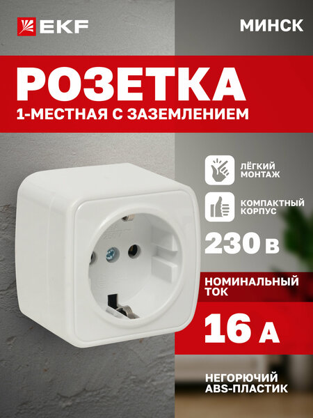16А, Розетка 1-местная ОП Минск, белая - 1 штука, с заземлением