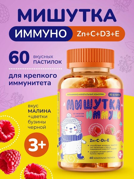 Мармеладные витамины для детей и подростков Мишутка Иммуно от BioForte - это витаминно - минеральный комплекс жевательных мишек со вкусом малины. Уникальный комплекс мультивитаминов в виде вкусных мармеладных пастилок, специально разработанный для поддержки иммунитета детей и подростков. Эти витамины незаменимы при интенсивных учебных нагрузках в школе, так как способствуют активизации мышления, поддержке организма в период обучения, адаптации к вирусным нагрузкам, способствуют росту и развитию, а также зарядят активностью на весь день. Витамин C – 50 мг помогает укреплять иммунную систему, помогает бороться организму с вирусами. Витамин Е – 9 мг для антиоксидантной защиты клеток и поддержания активности и силы. Витамин D3 – 300 МЕ для укрепления костей, что важно для роста и гармоничного развития детей. Цинк – 4,5 мг важен для здоровья кожи, иммунитета и регуляции обмена веществ. Мишки вкусняшки Иммуно станут отличным выбором для родителей, заботящихся о здоровье своих детей.