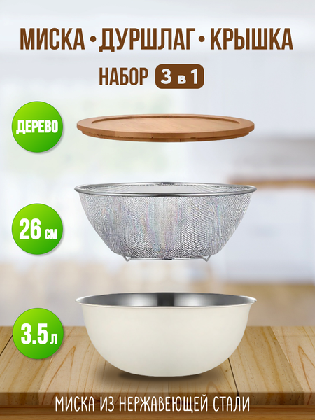 Миска металлическая из нержавеющей стали; деревянная крышка из бамбука; дуршлаг для мойки круп, овощей и фруктов