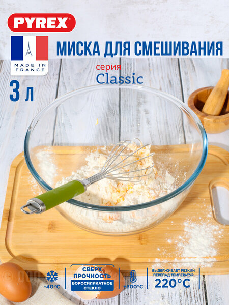 Миска для смешивания Pyrex CLASSIC 3л - это великолепный помощник на кухне. Миска для смешивания Pyrex CLASSIC 3л подойдёт для смешивания ингредиентов при приготовлении разнообразных блюд, а так же послужит салатником или вазой для фруктов. Высококачественное боросиликатное закаленное стекло обладает увеличенной ударопрочностью, не боится царапин, которые могут возникать при использовании венчика и других металлических аксессуаров. Миску можно также использовать в качестве формы для выпечки, поскольку стекло Pyrex выдерживает резкий перепад температур до 220 С. Диаметр предмета 24 см Высота предмета 11 см