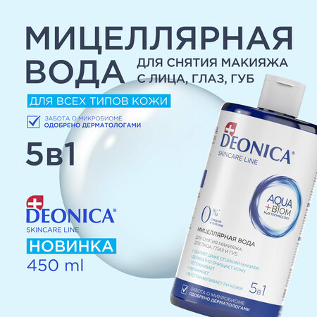 Мицеллярная вода для снятия макияжа 5 в 1 Deonica Skinecare line — это универсальное средство, которое сочетает в себе сразу несколько функций, обеспечивая эффективное очищение кожи лица, глаз и губ. Это незаменимый элемент ухода, благодаря своей способности мягко и эффективно удалять макияж и загрязнения, не вызывая раздражения. Средство для снятия макияжа создано с использованием современных технологий, которые позволяют ему глубоко очищать, не повреждая естественный барьер. Мицелярка подходит для всех типов кожи, включая чувствительную, и может использоваться ежедневно без риска пересушивания. В составе средства по уходу инновационный комплекс Aquabiom H20, включающий в себя термальную воду из источника Пролом в Сербии, которая насыщает влагой, а также фруктоолигосахариды, которые работают как пребиотики, способствующие росту полезных бактерий. Лизаты лакто- и бифидобактерий стимулируют восстановительные процессы, успокаивают и укрепляют защитный барьер, увеличивают содержание церамидов в роговом слое. Ну а масла оливы и миндаля предотвратят сухость, ускоряя восстановление. Мицеллярная вода Деоника быстро и деликатно удаляет макияж с лица, глаз и губ, легко справляется с удалением даже водостойкой косметики, при этом не требует сильного трения, что минимизирует риск раздражения и покраснений. Это делает очищающее средство идеальным выбором для тех, кто хочет сохранить кожу здоровой и чистой, не прибегая к агрессивным средствам. Жидкость для снятия макияжа идеальна в качестве умывалки на каждый день. Умывашка обеспечивает коже свежесть и чистоту, делая её мягкой, увлажненной и подготовленной к нанесению последующих уходовых средств. Используйте мицеллярную воду с увлажняющим кремом для лица – это обеспечит комплексный подход, который не только увлажняет, но и питает кожу, восстанавливая её структуру и улучшая внешний вид. Deonica Skinecare line – нужна как вода!