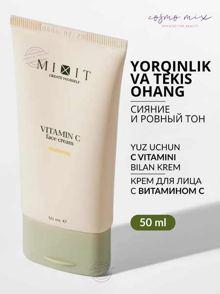 {"widgets":{"@card/UniversalPromoBadge":{"/content/page/fancyPage/defaultPage/universalPromoBadge":{"wrapperProps":{"margins":{"bottom":"3"}},"initialTime":1760752578525,"offerComposeId":"2698280574151943441"}}},"meta":{"/content/page/fancyPage/defaultPage/universalPromoBadge":{"name":"@card/UniversalPromoBadge"}},"collections":{"productServiceSnippets":{"2698280574151943441":{"productSnippet":{"type":"MODEL_CARD_LAYOUT","productPayload":{"snippetStyle":"NORMAL","title":{"value":"MIXIT Vitamin C Face Cream — осветляющий крем для лица с витамином C, 50 мл"},"badges":{},"price":{"actualPrice":{"amount":{"intPart":111720,"currency":"UZS"},"style":"RED","type":"OTHER_DISCOUNT"},"oldPrice":{"amount":{"intPart":126000,"currency":"UZS"},"style":"STRIKETHROWED"}},"gallery":{"mediaItems":[{"picture":{"baseUrl":"https://avatars.mds.yandex.net/get-mpic/15380440/2a00000198753e092d13ca908b9f71de058d/","width":1080,"height":1440,"title":"MIXIT Vitamin C Face Cream — осветляющий крем для лица с витамином C, 50 мл"},"type":"IMAGE"},{"picture":{"baseUrl":"https://avatars.mds.yandex.net/get-mpic/15426853/2a00000198753e092ca713045ff94faf5f4c/","width":1080,"height":1440,"title":"MIXIT Vitamin C Face Cream — осветляющий крем для лица с витамином C, 50 мл"},"type":"IMAGE"},{"picture":{"baseUrl":"https://avatars.mds.yandex.net/get-mpic/15429936/2a00000198753e092f457853cc03abb35062/","width":1080,"height":1440,"title":"MIXIT Vitamin C Face Cream — осветляющий крем для лица с витамином C, 50 мл"},"type":"IMAGE"},{"video":{"url":"https://runtime.strm.yandex.ru/player/video/vplve36d6sek34nxizmw","width":1080,"height":1440,"title":"MIXIT Vitamin C Face Cream — осветляющий крем для лица с витамином C, 50 мл","preview":{"baseUrl":"https://avatars.mds.yandex.net/get-mpic/15142316/2a00000198754ad435984df8f31d025e5f42/","width":960,"height":1280,"title":"MIXIT Vitamin C Face Cream — осветляющий крем для лица с витамином C, 50 мл"},"streams":[{"type":"dash","url":"https://strm.yandex.ru/vod/vh-market-upload-converted/vod-content/vplve36d6sek34nxizmw/1e782738-a015-42bd-8b78-4bab07670ab4/kaltura/desc_d50ea7d9367590dfddd6025531c4d422/x/ysign1=7cf99b44890094ba4e8e4da98349d90679e204d0bdcdc56f7474134bfdd7d255,abcID=56084,chID=vplcw5a4be2almmy7knw,pfx,sfx,ts=68f596c2/manifest.mpd?packager=1"},{"type":"hls","url":"https://strm.yandex.ru/vod/vh-market-upload-converted/vod-content/vplve36d6sek34nxizmw/1e782738-a015-42bd-8b78-4bab07670ab4/kaltura/desc_d50ea7d9367590dfddd6025531c4d422/x/ysign1=b2479795cbf1530d6c2aa3fd447fc0715c52e870c4be84ef273b66d032da3237,abcID=56084,chID=vplcw5a4be2almmy7knw,pfx,sfx,ts=68f596c2/master.m3u8?packager=1"}]},"type":"VIDEO"}],"galleryType":"VISUAL"},"rating":{"ratingValue":4,"ratingCount":1,"reviewsCount":1,"ratingCountStats":{"cnt1":0,"cnt2":0,"cnt3":0,"cnt4":1,"cnt5":0}},"wishlistButton":{"businessId":187073527,"mskuId":4426310499,"modelId":1199259304,"oskuId":4569625146,"offerId":"7JIEOha622ivANEdXs8VYw"}},"baobabPayload":{"type":"offer","wareId":"7JIEOha622ivANEdXs8VYw","modelId":1199259304,"marketSku":"4426310499","snippet_type":"product","isExpress":false,"price":111720,"promo_attributes":[{"promoType":"empty-promo","shopPromoId":"cf_132696","promoKey":"Blnqlrzs4Z6-j5RTZUNTOg"},{"promoType":"dco-extra-discount","shopPromoId":"marketuz_1470-part-0_fast_promo","promoKey":"_IBWYNsh9FpIBSfFOVoDuw","parentPromoId":"personal_promos"}],"additionalPrices":[{"priceType":"withDiscount","priceValue":111720},{"priceType":"unknown","priceValue":126000}],"vendorId":16401285,"hid":63989416,"shopId":431782,"shopSku":"20464","supplierId":187073526,"supplierType":3,"isUltima":false,"oskuId":4569625146,"stockCount":6}}}}}}
