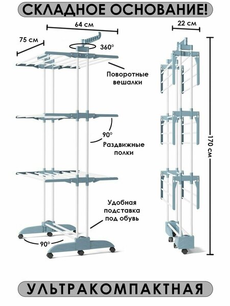 Универсальная многофункциональная напольная складная сушилка вешалка для белья. Это незаменимый помощник вам в удобном хранении ваших вещей и обуви. Простая и надежная металлическая конструкция обеспечит долгий срок службы вешалки и удобство ее эксплуатации. Благодаря колесикам вы легко можете передвигать вешалку с места на место, не затрачивая много усилий. Размеры вешалки: от 75 до 126х64х170см.