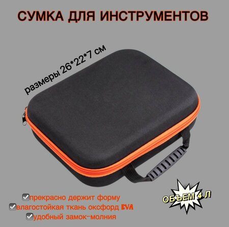 Сумка-органайзер предназначена для хранения и транспортировки инструментов , рыболовных снастей, автомобильных принадлежностей. Сумка выполнена из синтетического водонепроницаемого материала, имеет очень долгий срок службы и прекрасно защищает инструменты при работе в неблагоприятных условиях. Пригодится слесарям, монтажникам, электрикам, а также автомобилистам, рыбакам . Сумка оснащена крепкой прорезиненной ручкой для удобства транспортировки. Внутри имеется сетчатый карман для более мелких деталей. Данный размер сумки подойдет для хранения и переноски небольших электроинструментов (шуруповерты, лобзики), а также любых наборов ручного инструмента. Также удобно хранить рыболовные снасти и катушки. Пользуется большим спросом для хранения инструментов в автомобиле. Отличный подарок мужу, брату, коллеге.