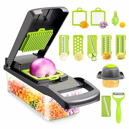Терка которая реально работает! Многофункциональная ручная фрукто-овощерезка мультислайсер с кнопкой 14 предметов в 1. Устали от ежедневного приготовления пищи? С мультифункциональной ручной овощерезкой вы будете наслаждаться процессом! Для того, чтобы готовить с удовольствием вам нужен всего один помощник на кухне - компактный мультислайсер 14 в1. Изготовлена из пищевой нержавеющей стали и АБС-пластика. Он предлагает всю функциональность нескольких приборов со сменными нержавеющими лезвиями. Можно нарезать все виды овощей и фруктов, а также натереть сыр. Мультислайсер для овощей и фруктов имеет в комплекте 8 насадок: крупная, мелкая шинковка для кубиков 6 и 11 мм, терка двух видов для идеальной соломки, терка для рассыпчатой цедры, острые лезвия для нарезки ровных и гофрированных слайсов. Дополнительно в комплект включены овощечистка, разделитель для яиц, сетка для мытья и сушки овощей, фруктов. Ручная овощерезка-терка оснащена удобным и вместительным контейнером из пищевого пластика, который также можно использовать для хранения готовых к употреблению овощей и фруктов. , Функция самоочистки контейнера, удобная и понятная сборка всех компонентов овощерезки делают ее легкой в использовании и значительно экономят ваше время. Спецификация: Материал: пластик, нержавеющая сталь Размеры: 33.5x12.5x10 см Измельчитель отлично подходит для следующий продуктов питания: овощи, фрукты, ягоды. Данный прибор не только отличный для кухни инвентарь, но и подарок: маме и дочке, сестре, родителям, маме, папе, отцу, бабушке, дедушке, месте, девушке, парню, сыну на любой праздник: день рождения, свадьба, Новый год, 8 марта, 23 февраля, 14 февраля, выпускной, день учителя, день свадьбы, юбилей.