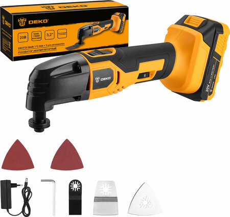 Реноватор DEKO DKOT20 Multi 063-2050 является компактным инструментом с расширенной функциональностью, с помощью которого можно выполнять резку, пиление и шлифование изделий из разных материалов. В данной модели реализована технология регулировки интенсивности вращения оснастки. Форма корпуса способствует комфортному удержанию инструмента. Автономная работа DEKO DKOT20 Multi 063-2050 осуществляется на основе литий-ионного аккумулятора с напряжением 20 В. В комплекте поставляются такие аксессуары, как: подошва, набор шлифлистов, лезвие-скребок, погружной ключ, шестигранный ключ и устройство зарядки. Характеристики Реноватор DEKO DKOT20 Multi 063-2050: Вес: 1.23 кг Вес в упаковке: 1.5 кг Виды работ: пиление, резка, шлифование Возможность подключения к пылесосу: нет Высота: 8.9 см Высота в упаковке: 100 мм Гарантия от производителя: 12 мес. Длина: 26 см Длина в упаковке: 265 мм Емкость аккумулятора: 1.5 А*ч Зарядное устройство в комплекте: 1 шт Класс: бытовой Количество аккумуляторов-батареек в комплекте: 1 Количество насадок: 3 шт Комплектация: документация, шестигранный ключ, лезвие, набор шлифовальных листов, зарядное устройство, аккумулятор, подошва для шлифования, погружной нож Максимальная частота колебаний: 18000 кол-мин Минимальная частота колебаний: 6000 кол-мин Модель: DEKO DKOT20 Multi 063-2050 Модель аккумулятора: DEKO DKCD20FU-Li Морозоустойчивый провод: нет Напряжение аккумулятора: 20 В Плавный пуск: нет Поддержание постоянного количества колебаний под нагрузкой: нет Подсветка: нет Регулировка колебаний: есть Страна-производитель: Китай Тип: реноватор Тип аккумулятора-батареек: Li-ion Тип двигателя: щеточный Тип крепления аккумулятора: слайдер Тип питания: аккумулятор Тип соединения: OIS Тип упаковки: коробка Угол колебаний: L-R 3.2° Ширина: 10.9 см Ширина в упаковке: 110 мм Электронная регулировка колебаний: есть