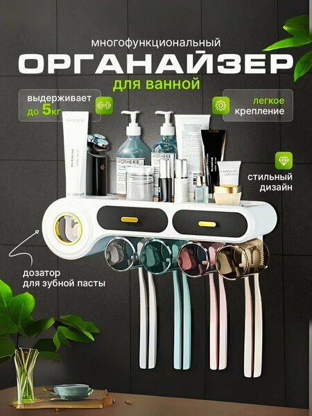 Многофункциональный органайзер для ванной–держателем на 8 щеток и дозатором