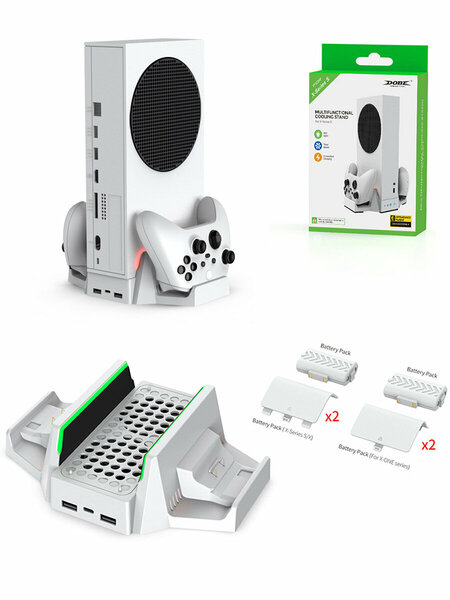 комплектация: охлаждающая подставка для консоли XBOX Series S, 2 аккумулятора для геймпадов, 2 крышки для геймпадов XBOX Series S/X, 2 крышки для геймпадов XBOX One, кабель для питания подставки; 3 скорости вращения вентиляторов