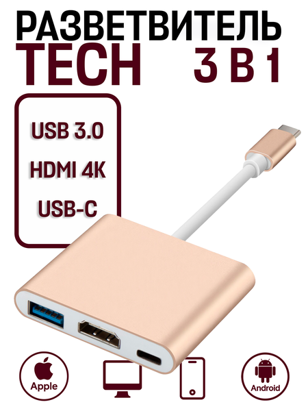 Многопортовый кабель-адаптер TECH разветвлитель Type-C - 3 в 1 представляет собой уникальное устройство, которое объединяет в себе функции нескольких аксессуаров. Он позволяет передавать изображение со смартфона, планшета, ноутбука или компьютера с порта USB-C на телевизор, монитор или проектор со входом HDMI. Адаптер также позволяет дублировать или расширить пространство рабочего стола Вашего ПК или ноутбука на дополнительный монитор, телевизор, проектор. Многопортовый кабель-адаптер TECH разветвлитель Type-C - 3 в 1 оснащен портом USB 3.0 Type-A, который обеспечивает максимальную скорость обмена информацией. К нему возможно подключение периферийных устройств, таких как флешка, внешний жесткий диск, картридер, клавиатура, мышь и других адаптеров и хабов. Порт USB 3.1 Type-C предназначен для зарядки устройства во время работы адаптера. Многопортовый кабель-адаптер TECH разветвлитель Type-C - 3 в 1 выполнен в золотистом цвете, что придает ему элегантный вид. Он оснащен позолоченными контактами и экранированным кабелем, что обеспечивает надежность и долговечность использования. В упаковке поставляется 1 шт. адаптера.