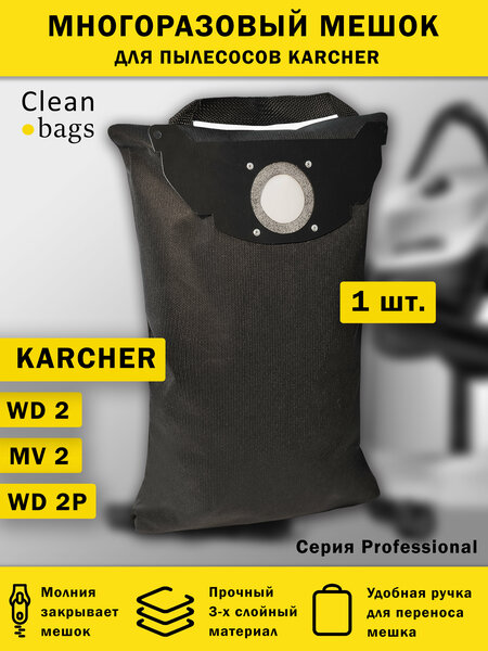 Многоразовый синтетический мешок с молнией Clean bags серии PROFESSIONALиспользуется как расходный материал для строительного пылесоса Karcher серии WD2, MV2, A / Керхер Керхер вд2. Особенности мешка: Многослойный материал. Высокий уровень фильтрации и длительный срок службы. Отлично собирает и удерживает острые предметы, пыль, влажный мусор. Не снижает мощность всасывания пылесоса. На мешке - пылесборнике имеется молния, которая позволяет без труда освобождать мешок от мусора, делая его использование многоразовым. Объем мешка пылесборника до 15 л. Диаметр фланца 63 мм. Совместимость: KARCHER WD2, KARCHER WD 2, KARCHER WD 2 CARTRIDGE FILTER KIT, KARCHER WD 2 EU II, KARCHER WD 2 HOME, KARCHER WD 2 PREMIUM BASIC, KARCHER A 2000-2099 SERIE, KARCHER A 2003, KARCHER A 2004, KARCHER A 2014, KARCHER A 2024, KARCHER A 2054, KARCHER A 2064, KARCHER A 2074, KARCHER MV 2, KARCHER MV2, KARCHER S 2500, KARCHER WD 2.000, KARCHER WD 2.200 *EU-I. Многоразовые мешки серии PROFESSIONALдля пылесоса Karcher WD2 от Clean bags надежное решение для Вашей работы!