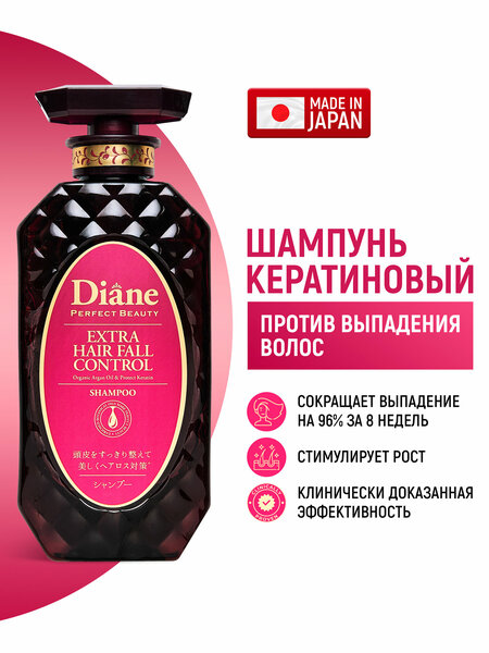 Японский кератиновый шампунь Moist Diane Perfect Beauty уменьшает выпадение волос, укрепляет и способствует их росту. 16 натуральных экстрактов, 3 вида кератина и 2 вида масел способствуют уменьшению выпадения волос на 96% за 8 недель применения. При регулярном использовании волосы становятся густыми, сильными и блестящими. Комбинация из шестнадцати натуральных экстрактов комплексно воздействует на проблемы волос и кожи головы: усиливает микроциркуляцию, питает, укрепляет волосяные фолликулы, воздействует на стволовые клетки кожи головы и запускает процессы роста волос. Масло арганы и семян манго увлажняют и питают кожу головы, ускоряют регенерацию поврежденных клеток и стимулируют рост волос. Эффективность всей линейки средств Moist Diane Perfect Beauty Extra Hair Fall Control подтверждена клинически. Не содержит сульфатов, силиконов, парабенов и красителей. pH шампуня: 5.75. Продукция бренда Moist Diane не тестируется на животных.