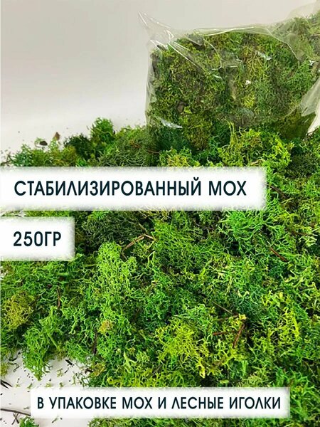Стабилизированный мох STABFLORA с иголочками — это уникальный материал, который привнесет в ваш интерьер нотку природной свежести и уюта. Этот мох сохраняет свою естественную красоту и мягкую текстуру на долгие годы, не требуя ухода и полива. Иголочки придают моху дополнительный объем и реалистичность, создавая эффект настоящего леса. Используйте его для декоративных композиций, оформления цветочных горшков, создания оригинальных панно или просто как самостоятельный элемент декора. Используйте мох для создания творческих поделок и произведений искусства. Серия мха относится к эконом сегменту. Стабилизированный мох ягель для декора. Стабилизирован на основе глицерина. Позволяет мху служить 8-10лет при правильном использовании. Избегайте прямых солнечных лучей, держите влажность не менее 35%. Природный мох уникальный экологичный материал, гипоаллергенный, дает широкие возможности для творчества. В упаковке мох и лесные иголочки, в упаковке присутствует мох разных оттенков зеленого. Декоративный мох имеет различный размер пучков, выраженные шапочки отсутствуют, либо маленькие. Мох стабилизированный используется при работе с эпоксидной смолой, плоскими поверхностями, для декора флорариумов, также в качестве наполнителя в подарочные упаковки. Отлично подойдет для поделок, или как наполнитель в горшок с цветами. Мох для декора 250 грамм. Упакован в прозрачный пакет как на фото.