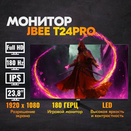 Безрамочный LED монитор для компьютера JBEE с диагональю 23,8 дюйма сочетает в себе все необходимые свойства современного монитора. Высокая четкость изображения Full HD и разрешение экрана 1920х1080, точная цветопередача, низкое время отклика, высокая яркость и контрастность, частота обновления экрана 180Гц, широкий угол обзора, как по вертикали, так и по горизонтали, матовое антибликовое покрытие, защита для глаз, а также меню на русском языке для удобной настройки, два видеопорта, USB 2.0 для зарядки мобильных устройств и разъем для подключения наушников. Благодаря высоким техническим характеристикам монитора для ПК JBEE T24PRO вы полностью ощутите всю красочность виртуального мира, передаваемого в играх и фильмах, а также оцените удобство работы, как в графических редакторах, так и просто работая с текстом. Система защиты зрения в ЖК-мониторе JBEE T24PRO реализована благодаря двум технологиями, Low Blue Light и Flicker free, которые в совокупности позволяют значительно снизить нагрузку на глаза пользователя. Технология Low Blue Light уменьшает интенсивность синего света, который вреден для глаз. Технология Flicker free обеспечивает монитор стабильным питанием, благодаря чему устраняется неприятное и утомляющее мерцание изображения. С игровым LED монитором JBEE T24PRO комфортно проводить за компьютером долгие периоды времени, будь то учебные онлайн курсы, прохождение видеоигр, обработка фотографий или верстка кода. Чем бы вы ни занимались, вашим глазам будет комфортно. Игровой монитор JBEE T24PRO оснащен ЖК панелью IPS класса, которая позволяет получить изображение с максимальным качеством и широким углом обзора. IPS монитор JBEE T24PRO воспроизводит яркие цвета без существенных искажений. Точная цветопередача незаменима во время учебы или работы с использованием графических материалов, а при просмотре фильма яркая и сочная картинка добавляет дополнительное удовольствие. Специальное покрытие экрана игрового монитора JBEE T24PRO обеспечивает четкое изображение в любой обстановке и при любом освещении, даже в самый солнечный день. Матовый экран снижает количество отражаемого света. Экран с антибликовым покрытием не только повышает качество изображения, но и делает работу за компьютером более комфортной как при естественном освещении, так и при ярком искусственном освещении. Технология IPS, по которой изготовлена LED панель игрового монитора JBEE T24PRO, обеспечивает широкие углы обзора 178° как по вертикали, так и по горизонтали. Благодаря широким углам обзора контент на этом ЖК экране могут смотреть одновременно несколько человек, и каждый будет видеть отличную картинку без существенных искажений цветопередачи. В дополнение к широким углам обзора игрового монитора для ПК дополнительное удобство добавляет подставка с настройкой положения экрана, идущая в комплекте. На подставке также имеется специальный кронштейн для аккуратного размещения проводов. Наклон экрана Full HD монитора JBEE T24PRO регулируется в диапазоне от -5° до 20° для индивидуальной настройки рабочего или игрового места под потребности пользователя. LED монитор JBEE T24PRO помещен в безрамочный корпус, который улучшает визуальное восприятие просматриваемого контента и выглядит более стильно и современно по сравнению с традиционными моделями мониторов с толстыми рамками. Игровой ЖК-монитор совместим с крепежом стандарта VESA, раз