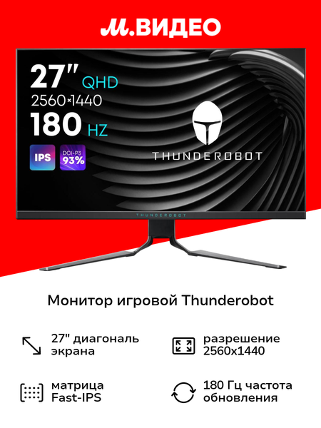 Игровой монитор Thunderobot LQ27F180L-Q JT00EG00JRU обладает экраном диагональю 27 дюймов. Показатель яркости соответствует 280 кд/м². Угол обзора 178° по вертикали и горизонтали позволяет смотреть контент с бокового ракурса. Время отклика устройства составляет 1 мс. В случае необходимости угол наклона монитора можно отрегулировать в диапазоне от -5°С до +15°С. • Тонкая рамка Увеличивает полезную площадь, что создает максимальный комфорт в играх и во время просмотра фильмов. • Разрешение 2560х1440 пикселей Обеспечивает воспроизведение детализированного изображения. • Частота обновления 180 Гц Гарантирует получение плавного скроллинга, что открывает преимущество в играх. • Матовое покрытие Уменьшает риск возникновения бликов. Подключение дополнительных устройств осуществляется с помощью разъемов DisplayPort, HDMI версии 2.0 и выхода для наушников. Максимальная потребляемая мощность монитора - 48 Вт, в спящем режиме - 0,5 Вт. В комплект входят подставка, кабель DisplayPort и блок питания.