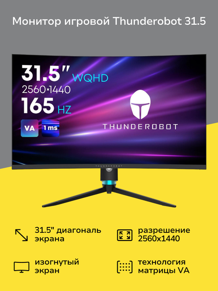 Игровой монитор Thunderobot Q32HL - 31,5-дюймовая модель разрешением 2560х1440 пикселей (QHD), что обеспечивает отличную детализацию, и частотой обновления до 165 ГГц. Благодаря последней можно быть на шаг впереди соперников, что особенно важно в соревновательных онлайн-играх. Дисплей - изогнутый 1500R. В основе работы лежит матрица типа VA. Adaptive-Sync обеспечивает синхронизацию частоты обновления и частоты кадров графического процессора - это способствует уменьшению задержки и устранению визуальных разрывов. Для защиты зрения предусмотрена технология Low Blue Light - отвечает за уменьшение компонента синего света, который излучается монитором. HDR делает блики ярче, тени - темнее. Яркость дисплея - 280 кд/м². В сочетании с красочными цветами обеспечивается насыщенная картинка. Потребляемая мощность устройства - не более 60 Вт. У подставки широкий диапазон настроек: можно поворачивать, регулировать дисплей по наклону и высоте. Габаритные размеры (без подставки) - 711х65х415 мм, вес - 7,45 кг.