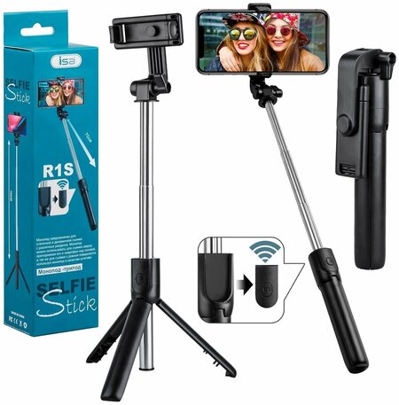 Беспроводной монопод для селфи R1S с треногой и пультом совместим со всеми устройствами и очень прост в использовании. Монопод имеет телескопический стержень, встроенную треногу и Bluetooth пульт для дистанционных селфи на расстоянии до 10 м. С помощью такого устройства делать фотографии будет намного практичнее и проще. Главные преимущества: - регулируемая телескопическая ручка, поворот держателя смартфона на 360 градусов; - маленький вес - его легко держать в одной руке, - крепления надежно фиксируют ваш гаджет, - Bluetooth-пульт дистанционного управления в комплекте и фиксируется на самом моноподе, регулируемая ширина держателя. Предназначен для статичной и динамичной съемки с различных ракурсов. Можно использовать для съемки сверху, приподнимая над головой или на ровной поверхности, трансформируя в треногу и устанавливая как штатив. Длина в сложенном виде - 18,5 см, в раздвинутом - 70 см. Тип крепления цифровых устройств - зажим. Кол-во секций - 6. Совместим со смартфонами шириной от 6 до 9 см. Комплект: монопод-трипод, пульт ДУ