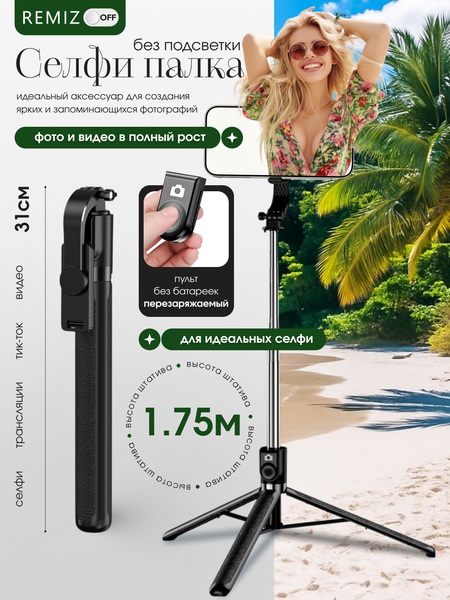 Универсальная селфи палка REMIZOFF — идеальный выбор для съёмки фото и видео на телефон. Этот монопод 3-в-1 работает как штатив и палка для селфи, подходит для iPhone и Android. С максимальной длиной 175 см он отлично справляется с групповыми фото, съёмкой с высоты и блогингом. Благодаря Bluetooth-пульту на ножке, вы сможете делать снимки на расстоянии до 10 м без касания телефона. Пульт быстро подключается к любому смартфону: айфон и андроид. Надёжный держатель легко поворачивается для съёмки в вертикальном и горизонтальном формате. Лёгкий, прочный и компактный — всего 30 см в сложенном виде, легко помещается в сумке. Идеален для путешествий, съёмок, прямых эфиров, бьюти-контента и видеозвонков. Селфи палка с кнопкой от REMIZOFF — ваш незаменимый аксессуар для стильных селфи и ярких видео. Подходит для всех, кто ценит качество и удобство.