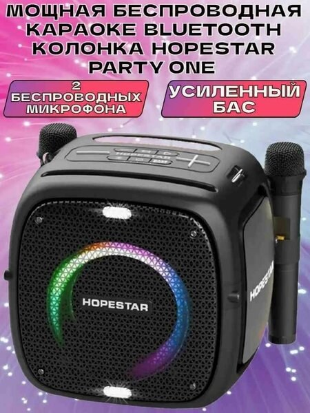 Мощная беспроводная караоке bluetooth колонка HOPESTAR PARTY ONE - это поистине революционное слово в индустрии портативных акустических систем! Обладая уникальным дизайном, данная колонка способна выдавать звук пиковой мощностью в 80 Вт! Оснащена сабвуфером и твиттером с мощнейшим басом, но в тоже время кристально чистыми и прозрачными средними и высокими частотами. Данная колонка отлично подойдёт для проведения праздников как дома, так и на улице. Линейку портативной Bluetooth акустики HOPESTAR справедливо именуют "убийцей" , поскольку её звучание превосходит все ожидания, однако стоимость HOPESTAR гораздо доступнее! Громкий, мощный, насыщенный и кристально чистый звук и наличие 2ух цифровых беспроводных микрофонов для караоке в комплекте - всё что нужно для успешного проведения праздника! Данная модель также даёт возможность подключения к колонке ещё одного проводного микрофона. Аккумулятор огромной ёмкости (12500 мАч) позволяет использовать колонку как пауэр-банк. Наплечный ремень для переноски позволит Вам не расставаться с любимой колонкой в любых ситуациях. Для караоке достаточно подключить к колонке телефон, планшет или телевизор с интернетом, найти на YouTube любимую песню, добавив в поисковом запросе к названию песни слово "караоке", и начать петь и развлекаться в компании друзей! Также колонка обладает функцией TWS (подключение в параллель другой Bluetooth колонки для получения стереопары). Куда бы Вы ни взяли с собой HOPESTAR PARTY ONE, Вы всегда будете королём вечеринки и находиться в центре внимания. Потому что там, где HOPESTAR, там всегда праздник и веселье!