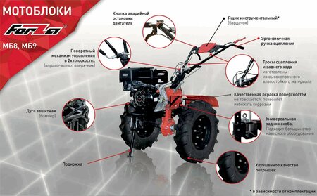 Лидер продаж! Лучшее соотношение цена-качество! Мотоблок Forza МБ9-1307 относится к классу средних-тяжелых мотоблоков. Данную модель отличает ряд преимуществ по сравнению с конкурентами: 1. Мотоблок собран на конвеерном производстве в России. После сборки мотоблок заводится, проверяется работоспособность всех узлов и агрегатов, далее масло сливается для транспортировки мотоблока до покупателя. 2. Благодаря тому, что двигатель изготовлен по спецификации Honda, мотоблок оснащен двигателем, имеющим чугунную гильзу, что кардинально влияет на моторесурс агрегата. Благодаря гильзе улучшена теплопроводность цилиндра, мотор не перегревается, поршневые кольца не залегают, износ зеркала цилиндра - минимальный. Запуск двигателя легкий - с первого-второго раза. 3. Сцепление многодисковое, в масляной ванне, практически не изнашивается и выдерживает огромные нагрузки в отличие от ременного. 4. Корпус редуктора усиленный, полностью шестеренчатый, для нагрузок до 17 л. с, вал на колеса также усиленный шестигранный 31-32 мм, усиленная рамная конструкция. 5. Коробка передач имеет 3-ю пониженную скорость вперед (около 3-4 км/ч), крайне необходимую мотоблоку для использования его с активным и пассивным навесным оборудованием. За мотоблоком не нужно бегать и он более качественно выполняет операции. 6. Имеется ВОМ (вал отбора мощности) круглый на 18 мм, для установки на него автоматической грохотной картофелекопалки, роторной косилки, снегоотбрасывателя и т. п. 7. Руль регулируется вверх-вниз и горизонтально на 360", что позволяет разворачивать мотоблок на 180" для удобства использования, например с лопатой отвалом при чистке снега или роторной косилкой. 8. Огромные колеса размером 5-12" имеют глубокий агрессивный протектор и мягкую резину, что обеспечивает при весе мотоблока в 140 кг превосходную проходимость и тягу с навесным оборудованием. 9. Мотоблок универсален в своем использовании: культивация почвы разной твердости фрезами (в комплекте с мотоблоком), прополка почвы (спиралевидными фрезами), работа с плугом, посадка (автоматическая картофелесажалка), окучивание (окучник дисковый или двухрядный) и выкапывание картофеля (механический или грохотный автоматический картофелекопатель от ВОМ), перевозка грузов с тележкой, кошение травы и заготовка сена (роторной косилкой от ВОМ), уборка снега (лопатой отвалом или снегоуборщиком от ВОМ), использование совместно с задним или передним адаптером на 4-х колесах (получается минитрактор), использование с гусеничным модулем зимой вместо колес. 10. Минимальная цена, так как из-за производства в России удешевлена логистика, продажа без посредников и с минимальной торговой наценкой. 11. Большая сетка гарантийных сервисов по России, быстрое и легкое решение любых вопросов, запчасти и расходники всегда в наличии. 12. Компания-производитель в России успешно работает на рынке садовой техники более 25 лет! Мотоблок имеет большую ширину захвата (до 120см), укомплектован закаленными фрезами, что позволяет применять его на тяжелых грунтах и для обработки целины. Характеристики: Вес, кг: 140 Мощность, л. с: 13 Рабочий объем, см3: 389 Тип двигателя: четырехтактный воздушного охлаждения Модель двигателя: 188 (аналог Honda) Гильзованный двигатель: да Скорость движения мотоблока на колесах: от 3 до 15 км/ч Размер колёс: 5х12 Тип редуктора: зубчатая передача Ко