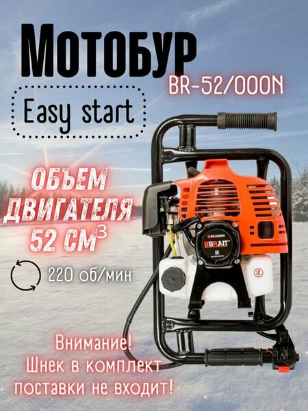 Мотобур BRAIT BR-52/000N используется для бурения отверстий в почве, например, при посадке молодых деревьев или обновлении забора. Обновленный дизайн и устройство, теперь работать мотобуром еще удобнее Система подкачки топлива обеспечивает стабильный пуск двигателя при любых погодных условиях Адаптирован для работы при низких температурах Широкий спектр шнеков различного диаметра и длины Система Easy start обеспечивает легкий пуск мотобура Технические характеристики: Габариты в упаковке — 450х370х325 Обороты шнека, об/мин — 220 об/мин Объем двигателя, см³ — 52 см³ Объем топливного бака, л — 0,8 Объем упаковки м3 — 0,037 Тип двигателя — 2-х тактный, одноцилиндровый Топливная смесь — 50/1 Мощность, Вт — 1500 #Мотобур; для бурения; бурение отверстий; для строительства; для лунок; для скважин; для фундамента; рытье; для грунта; для монтажа; бурение скважин; для бурения; ямобур; бензобур; мотобур; для бурения земли;