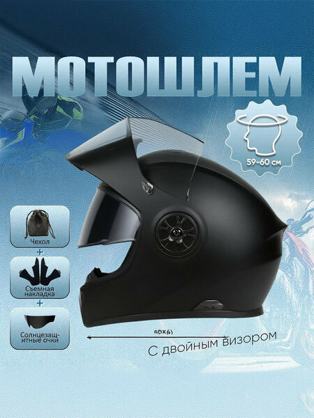 Мотошлем кроссовый, подходит для поездок на мотоциклах эндуро, квадроциклах, скутерах и мопедах. Мотоциклетный шлем является важной составляющей защитной экипировки для мотоспорта, которая обеспечивает безопасность водителя. Для плотного прилегания к голове внутри шлема имеется мягкая удобная 3d-подкладка. Съемная подкладка с возможностью стирки. Защитный шлем подходит для мужчин и женщин. Шлем так-же можно использовать для езды на самокатах, велосипедах и роликах. Может стать хорошим подарком на день рождение и торжество. Мотоциклетный шлем имеет полную защиту от ветра, холода и дождя - вы наслаждаетесь поездкой в любую погоду. Мотошлем из сверхпрочного противоударного ABS пластика, также имеет буферный слой из пены высокой плотности, который имеет данный мото шлем интеграл поглощает удары, обеспечивая защиту вашей головы от травм. Мотошлем оснащен вентиляционными клапанами для хорошей циркуляции воздуха. Шлем для мотоцикла обеспечивает вам максимальный комфорт, благодаря круговой вентиляции - во время поездки запотевание не грозит. Шлем на мотоцикл также обеспечен визором из поликарбоната устойчив к царапинам, защищает от ультрафиолета, легко снимается. - очками которые защищают ваши глаза от солнца и обеспечивают максимальную видимость в любых ситуациях. Размер XL, на обхват головы 59-60 см в зависимости от формы черепа. Выбирая шлем для мотоцикла с визором, вы получаете надежный, стильный и функциональный аксессуар для комфортной и безопасной езды на мотоцикле, скутере, мопеде, квадроцикле или другом транспортном средстве. ртной и безопасной езды на мотоцикле, скутере, мопеде, квадроцикле или другом транспортном средстве.