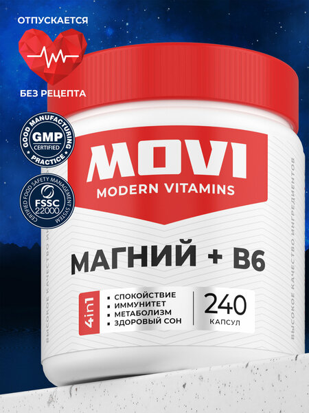 Комплекс Магний+В6 от MOVI — это 4 полезных действия в 1 добавке: снятие напряжения, повышение эмоциональной устойчивости, облегчение последствий стрессовых ситуаций и улучшение сна. Помимо этого, БАД положительно влияет на кровоснабжение, регулирует баланс кальция и натрия в клетках, стимулирует моторику кишечника. Магний — это жизненно важный элемент, находящийся во всех тканях организма. Он необходим для правильной работы клеток и участвует в реакциях обмена веществ. Снижает возбудимость нервной системы, помогает противостоять стрессам, стабилизирует сердечную деятельность и снижает частоту мигреней. Витамин B6 улучшает усвоение магния, обладает способностью фиксировать его в клетке, что важно, поскольку магний быстро выводится из организма. Одной упаковки (240 капсул) хватит на полный курс. Рекомендуется принимать по 2 капсулы 2 раза в день во время еды. Продолжительность курса - 1 месяц, при необходимости прием можно повторить. Продукт соответствует международным стандартам по сертификации FSSC, GMP, ISO и HACCP. В составе ингредиенты только высокого качества. Не содержит сахар, глютен, ГМО.