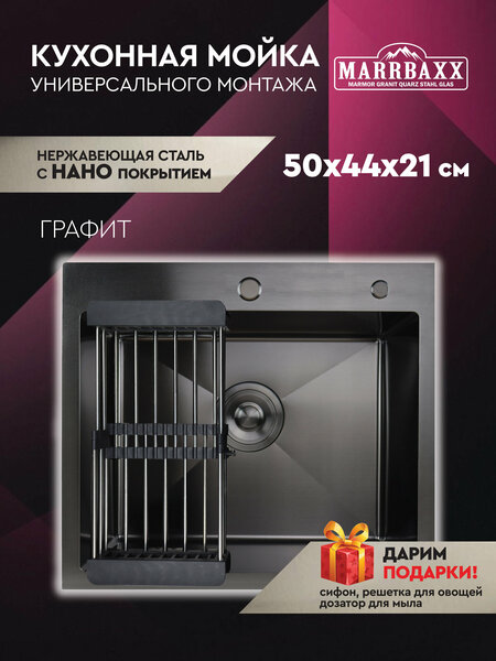 Красивая и надежная мойка для кухни MARRBAXX из премиальной нержавеющей стали - неизменный хит продаж и прекрасное решение для любой категории кухонных гарнитуров. Глубокая и компактная стальная раковина в цвете графит – это воплощение эстетики и практичности в быту. Антибактериальное покрытие PVD всегда остаётся чистым, не собирает воду и частицы грязи из-за особенности конструкции и покрытия. В комплекте к мойке 50*44 идет сливная арматура, удобный боковой коландер/решетка для сушки посуды, мытья фруктов и овощей и размораживания продуктов. Вместительная чаша мойки нерж глубиной 22 см позволяет расположить в мойке крупногабаритную посуду. Специальное шумоизоляционное покрытие поглощает шум воды, что позволяет с комфортом мыть посуду. Раковину для кухни можно установить как сверху так и снизу столешницы. Мойка 50 на 44 подходит для подстольного, настольного монтажа и как врезная. Эргономично встроенная кухонная мойка оптимизирует пространство снаружи и внутри. Любая столешница и накладная конструкция смотрятся единым целым, гармонично вписываются в стильный интерьер. На нержавеющей мойке 5044 предусмотрено два отверстия: одно для смесителя, второе можно использовать под дозатор или кран для фильтрованной воды. Прямоугольная железная раковина из качественной нержавеющей стали с большим запасом прочности, которая применяется в пищевой промышленности и не боится бытовой химии, царапин и прослужит долгие годы. Нержавейка не подвержена коррозийным изменениям, деформациям. Уникальное nano покрытие не впитывает грязь, жир, масло и устойчиво к воздействию агрессивных сред. Квадратная встраиваемая мойка из нержавейки изменит ваше представление об удобстве в быту. Стальная мойка с сифоном - отличный подарок любой хозяйке на новый год, новоселье, после ремонта. Сделайте заказ прямо сейчас по доступной цене и оцените преображение интерьера уже в самое ближайшее время! Кухонная мойка Марбакс - это выгодное вложение в Вашу комфортную жизнь.