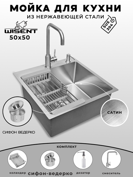 Мойка для кухни WISENT изготовлена из нержавеющей стали SUS304 толщиной от 1 до 3 мм. Химический состав и свойства делают марку 304 наиболее подходящей для применения в пищевой промышленности. Раковина для кухни показывает высокие характеристики коррозийной стойкости в агрессивных средах. Толщина стенки мойки составляет 1 мм, толщина бортика 3 мм. Мойка полуматовая. Шумоизоляция, нанесенная путем напыления, позволяет значительно снизить звук от потока воды. Коландер -это незаменимый аксессуар, который позволяет более рационально использовать пространство Вашей кухонной мойки. Он размещается в чаше и позволяет размораживать продукты или сушить посуду после мытья. Врезной дозатор для жидкого мыла или средства для мытья посуды поможет освободить место на кухне. Кухонная мойка имеет размеры: ширина 50 см, глубина 50 см, высота 22 см. Размер чаши: ширина 45 см, глубина 40 см, высота 21 см. В связи с особенностями производства в геометрии мойки допустимо расхождение 1-3мм. Раковина на кухню устанавливается на герметик и прижимается грузом. При данном способе установки края будут плотно прилегать к столешнице.