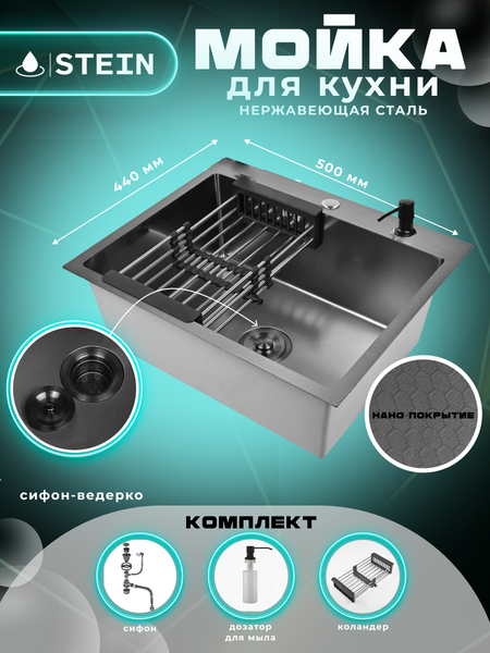 Мойка для кухни от бренда STEIN - это современное решение для вашей кухни. Врезная мойка отличается элегантным дизайном и функциональностью. PVD поверхность обеспечит долговечность и легкость в уходе квадратной мойки, имеет полуматовую поверхность. Кухонная раковина имеет глубокую чашу 21 см, что позволяет удобно мыть посуду и разнообразные продукты. Шумоизоляция нанесенная путем напыления на внешнюю сторону минимизирует уровень шума от воды во время использования. Сифон для раковины на кухню с ведерком, обеспечивает как высокое качество водоотведения, так и удобство для нее. Модель без крыла позволяет удобно расположить ее в любых условиях, сохраняя стильный вид интерьера. Мойка для кухни 50*44 имеет 2 отверстия, при этом одно отверстие для смесителя диаметром 35 мм подходит практически для всех смесителей, второе отверстие для фильтр для воды или дозатора диаметром 28 мм. Заглушки для отверстий поставляются в комплекте. Толщина стенки мойки составляет 1 мм, что гарантирует надежность и устойчивость к механическим повреждениям. Бортик мойка черная для кухни имеет толщину 3 мм, что добавляет прочности конструкции и делает изделия недоступными для коррозии. Мойка имеет дно с уклоном, что позволяет воде не задерживаться и не оставлять следов. Эта раковина для кухни графит прекрасно сочетается с различными стилями оформления и дизайна, станет отличным дополнением как классического, так и современного интерьеров. Высококачественный материал, а именно нержавающая сталь марки SUS304 позволит сохранить привлекательный внешний вид мойки с сифоном на протяжении длительного времени. Мойка для кухни нержавейка обеспечивает простоту и удобство эксплуатации поскольку может быть монтирована 3 способами: врезная, накладная, вровень со столешницей. Самый распространенный способ: раковина устанавливается на герметик и прижимается грузом и не требует креплений. Крепление для подстольного монтажа можно приобреси на Яндекс Маркете арт.51113653737 Установочный размер для мойки - 470*420 мм.