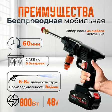 Мойка высокого давления аккумуляторная: функциональность и удобство Мойка высокого давления аккумуляторная предназначена для эффективной и быстрой очистки автомобиля и других поверхностей на даче или в гараже. В комплекте идут две аккумуляторные батареи, что обеспечивает непрерывную работу устройства. Мощность и максимальное давление Мойка оснащена мощным двигателем на 800 Вт, что позволяет достигать максимального давления в 60 бар. Это обеспечивает эффективное удаление грязи, масла и других загрязнений с различных поверхностей. Аккумулятор и напряжение сети Устройство работает от сети напряжением 220-230 В и имеет аккумулятор на 48 В, что обеспечивает длительное время работы без необходимости подключения к сети. Насадки и дополнительные функции В комплекте с мойкой высокого давления идут веерная насадка, грязевая фреза и пеногенератор. Это позволяет использовать различные режимы очистки и создавать обильную пену для более тщательной очистки. Дополнительные функции мойки высокого давления включают возможность забора воды из емкости, защиту от перегрева, использование моющего средства и подключение к системе водоснабжения. Длина шланга высокого давления составляет 5 метров, что обеспечивает удобство работы на различных расстояниях от источника воды. В целом, мойка высокого давления аккумуляторная станет незаменимым помощником для тех, кто ценит качество, удобство и эффективность в уборке.
