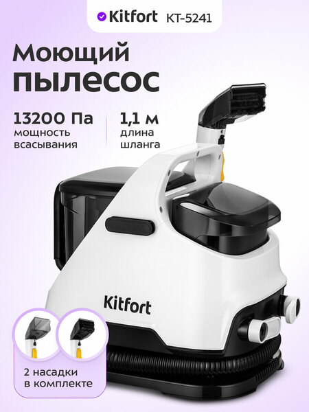 Моющий пылесос для ковров и мягкой мебели КТ-5241 поможет очистить обивку дивана, кресел, сидений в машине и другой мягкой мебели, а также ковры и ковровые покрытия. Пылесос автоматически подаёт чистую воду на поверхность, а затем всасывает её с загрязнениями. Распылите небольшое количество воды, а затем прижмите всасывающее отверстие к мокрой поверхности и плавно перемещайте насадку. В комплекте есть насадка с ворсовой щёткой, которая хорошо подходит для чистки ковров или въевшихся загрязнений. Насадка без ворсовой щётки удобна для очистки труднодоступных мест. У моющего пылесоса двухуровневая система фильтрации. Когда вода после очистки поверхности поступает в резервуар для грязной воды, она проходит через фильтр, задерживающий крупные частицы. Второй фильтр установлен на выходе из резервуара для грязной воды. В резервуар для чистой воды можно добавлять только воду. В резервуаре для грязной воды предусмотрен поплавок, который по мере наполнения резервуара поднимается. Когда резервуар наполнится, поплавок перекроет отверстие и защитит двигатель от влаги. У пылесоса небольшой размер и вес, а также есть ручка, держась за которую можно с лёгкостью перемещать прибор. У моющего пылесоса предусмотрены держатель шнура и держатель шланга, поэтому его можно компактно сложить и удобно хранить. Чистить моющий пылесос очень легко, так как насадка, резервуары и фильтры снимаются и промываются проточной водой.