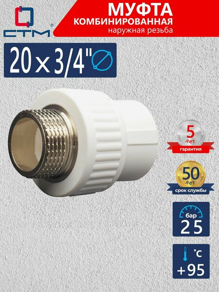 Муфта PP-R CPSM2034 комбинированная с наружной резьбой DN 20 х 3/4" СТМ пласт предназначена для соединения полипропиленовой трубы и с другими трубопроводами с резьбовым соединением, например, из металла или металлопластика. Переходник используется для подключения таких компонентов как краны, клапаны и другие фитинги систем водоснабжения и отопления. ПП трубы и фитинги применимы для горячей и холодной воды, напольного и радиаторного отопления. Монтаж соединителя со стороны полипропиленового трубопровода осуществляется методом раструбной сварки (свариваемые детали после разогрева вставляются друг в друга). Для этого необходимо использовать специальный сварочный аппарат и насадки для пайки. Муфта 20 мм на 3.4 дюйма изготавливается из полипропилена (Polypropylene random copolymer – полипропилен тип 3) и латуни с никелированным покрытием (ГОСТ 15537-2004). Материал экологически безвреден и не выделяет вредных веществ при эксплуатации. Водопровод из полипропиленовых труб и фитингов не меняет вкус, запах и цвет протекающей жидкости. Максимальное рабочее давление 25 Бар. Максимальная температура рабочей среды +95С. Срок службы - до 50 лет.