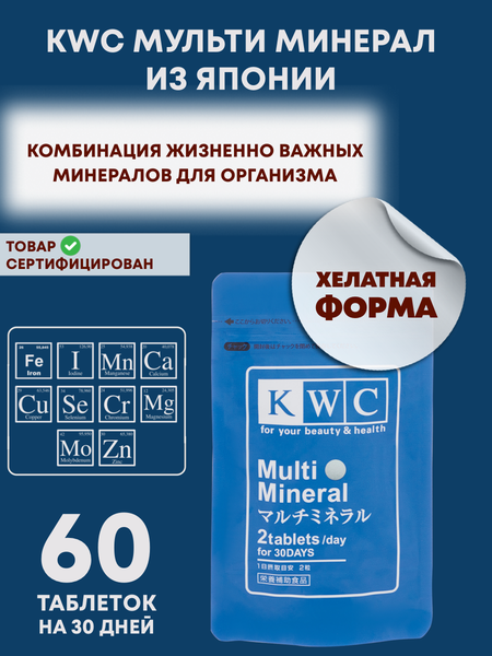 KWC Мульти Минерал – это комбинация 10 жизненно необходимых макро- и микроэлементов. Высокая степень очистки активных компонентов и японское качество. KWC Мульти Минерал - минералы из Японии - 10 жизненно необходимых макро- и микроэлементов. Высокая степень очистки активных компонентов и японское качество. Сила минералов Японии для Вашего здоровья и красоты. Профилактика минеральной недостаточности. Нормализация всех видов обмена веществ в организме. Регуляция многих жизненно важных функций организма. Нормальный рост и развитие органов и тканей человека. Содержание в суточной дозе (2 таблетки): Магний (из доломита) 32 мг, Кальций (из доломита) 52 мг, Железо (из пирофосфата железа) 19,0 мг, Йод (из дрожжевого экстракта) 0,15 мг, Марганец (из дрожжевого экстракта) 2 мг, Медь (из глюконата меди) 1,1 мг, Селен (из дрожжевого экстракта) 0,048 мг, Хром (из дрожжевого экстракта) 0,044 мг, Молибден (из дрожжевого экстракта) 0,045 мг, Цинк (из глюконата цинка) 15 мг.