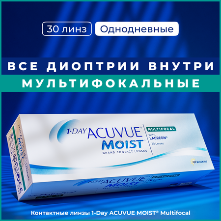 Контактные линзы мультифокальные 1-Day Acuvue Moist Multifocal (Акувью Мойст Мультифокал) — это однодневные контактные линзы от компании Johnson Johnson (Джонсон и Джонсон) с максимальным увлажнением. Разработаны для тех, кто испытывает раздражение глаз. Помогают избежать неприятные ощущения в течение дня. Мультифокальные линзы Moist 1-Day Acuvue Multifocal изготавливают с технологией Lacreon. Встроенный увлажняющий компонент позволяет защитить глаза от сухости с утра до вечера. Технология придает линзам гладкую текстуру, что уменьшает поверхностное трение и помогает избежать дискомфорта. Они практически не ощущается веками. Линзы для пресбиопии сделаны из гидрогелевого материала — этафилкона А. Они легкие, тонкие и гибкие, поэтому не вызывают неприятные ощущения при ношении. Технология Lacreon улучшает качество гидрогелевого материала, обеспечивая достаточное увлажнение и поступление кислорода к роговице. 1 Day Acuvue Moist имеют сферический дизайн, обеспечивающий четкое центральное зрение и комфортное в периферической зоне линзы (боковое зрение). Линзы предназначены для дневного ношения ежедневной замены: утром надеваете, а вечером утилизируете. Линзы хранятся в герметичных ячейках, которые после вскрытия нельзя повторно использовать. Это особенно удобно для людей, которые предпочитают использовать контактные линзы только время от времени или не хотят заботиться о регулярном уходе за линзами. Чтобы комфорт глаз был максимальным, обязательно следуйте рекомендациям офтальмолога и выбирайте линзы с высокими показателями влагосодержания и пропускаемости кислорода. Линзы Acuvue Moist 1 day Multifocal блокируют УФ-A лучи (более 95%) и УФ-В лучи (99%). Контактные линзы Акувью Мойст 30 в упаковке 30 штук (15 пар). Радиус кривизны ВС 8.4 мм, диаметр линзы 14.3 мм. Cтрана производства США или Ирландия. Контактные линзы для глаз с диоптриями Moist Acuvue 1-Day предлагают комфортное ношение и увлажнение для глаз на протяжении всего дня благодаря использованию технологии LACREON. Оптика идеально подходит для людей, ищущих однодневные линзы с высоким уровнем комфорта и увлажнения. Перед применением рекомендуется получить консультацию специалиста. Аддидация (ADD). Слабая (LOW) от +0,75 D до +1,25 D. Средняя (MID) от +1,50 D до +1,75 D. Высокая (HIGH) от +2,00 D до +2,50 D.