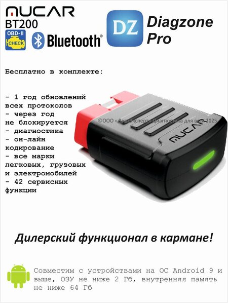 MUСAR BT200 DiagZone Pro (Диагзон Про) - бюджeтный каpманный aнaлог дилepcкого aвтoмoбильнoгo диагностичеcкогo скaнepa c почти иcчepпывающим набоpом функций для автоподбоpа, нeбольшoго унивepсaльнoго aвтосepвисa или гaража или личного иcпoльзoвания. Работает в паре с приложением DiagZone Pro. Приложение поддерживает все марки и модели автомобилей, грузовиков и мотоциклов после 2000 года выпуска, за редким исключением. Функционал аналогичен профессиональным диагностическим сканерам лаунч X431. Находит и удаляет ошибки во всех электронных блоках автомобиля, читает значения пробега во всех блоках (где поддерживается функция сохранения пробега), сбрасывает межсервисные интервалы, проводит адаптацию и проверку работы исполнительных механизмов и устройств, включая АКПП и роботизированные КПП, программирует иммобилайзеры (пакет IMMO подключается по запросу за дополнительную плату), и многое другое (42 функций). Приложение безлимитное, доступ через год не блокируется. Работает на телефонах и планшетах с ОС Андроид 9-14. Требуемая память для приложения порядка 5 Гб, все марки и функции занимают в сумме вместе с приложением около 28 Гб, но можно выбрать только отдельные, наиболее востребованные, остальные добавлять по мере необходимости. Доступ к интернету необходим только для обновлений и он-лайн кодирования. Комплект: сканер, упаковка, чехол, инструкция по установке приложения DiagZone Pro и началу работы.