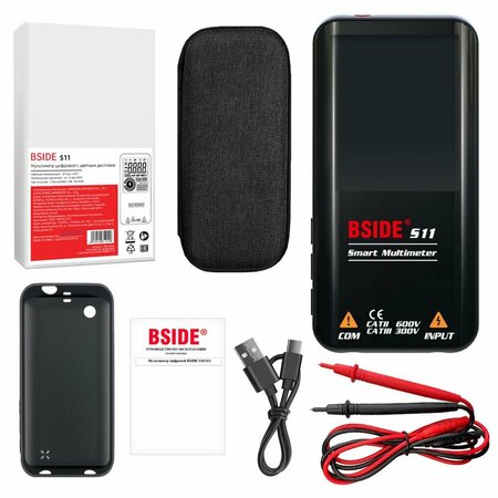Цифровой мультиметр BSIDE S11 предназначен для измерения основных электрических параметров - напряжения тока, сопротивления. Оснащен ЖК-дисплеем и датчиком для бесконтактного измерения, что делает прибор легким в использовании. Технические характеристики: Дисплей: цветной ЖК-дисплей Максимальное кол-во значений: 9999 Скорость измерения: обновление каждые 0,4 c Автоматическое измерение: постоянное/переменное напряжение, сопротивление Макс. напряжение (постоянный/переменный ток): 620 В Полярность: автоматическая индикация Индикация разряженной батареи: индикатор на дисплее Автоматическое выключение через 5 минут Макс. рабочая высота: 2000 м Условия эксплуатации: 0 оС – +40 оС, влажность <80% Условия хранения: -10 оС – +60 оС, влажность <70% Источник питания: Li-Ion аккумулятор/2 батарейки 1,5В ААА Комплектация: Мультиметр цифровой - 1 шт Щупы - 2 шт Кейс для хранения - 1 шт Чехол для хранения - 1 шт Адаптер Type-C - 1 шт Руководство по эксплуатации - 1 шт Гарантийный талон - 1 шт