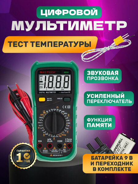 MY64N Mastech оснащен функцией удержания результата измерений DATA HOLD, которая позволяет проводить измерения в труднодоступных местах. Можно проводить тестирование диодов, прозвонку целостности цепи и измерение коэффициента усиления транзисторов. Благодаря своим функциям и возможностям, мультиметр MY64N Mastech является необходимым инструментом для тех, кто работает с электричеством и электроникой. Он позволяет экономить время и деньги, и избежать ненужных затрат на ремонт или замену электронных устройств.
