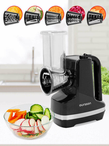 Электрическая мультирезка MS2051 Oursson мощностью 150 Вт быстро и качественно нарежет, нашинкует и измельчит фрукты, овощи, сыр, орехи, шоколад и другие ингредиенты. Овощерезка оснащена пятью насадками: классическая терка, терка для мелкой и крупной соломки, а также для ломтиков разной толщины. Электрический измельчитель снабжен толкателем для безопасной подачи продуктов, а прорезиненные ножки обеспечивают его устойчивость на любой поверхности. Шинковка легко разбирается и моется, делая эксплуатацию простой и удобной. Стильная резалка станет прекрасным подарком маме, папе, бабушке и на любой праздник. Готовьте легко и с удовольствием вместе со слайсером для нарезки «орсон»!