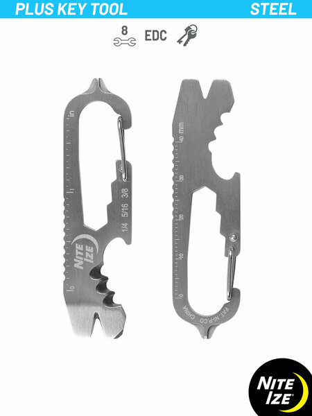 Мультитул-брелок Nite Ize DoohicKey Plus Key Tool это легкий мультиинструмент из нержавеющей стали портативного размера. Он оснащен карабином, который можно прикрепить, например, к связке ключей. С одной стороны расположены плоская отвертка, гвоздодер и режущая кромка, а с другой крестовая отвертка. Длинный край DoohicKey можно использовать в качестве линейки с дюймовой и сантиметровой разметкой, а на противоположной грани расположен гаечный ключ на три размера, открывалка для бутылок и серрейторное лезвие. Помимо прочего, наш мультиинструмент не вызывает вопросов у службы безопасности аэропортов. ---
