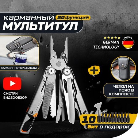 Мультитул 10в1 ― многофункциональный инструмент. С его помощью можно открыть консервную банку, вкрутить шуруп или заострить рыболовные крючки. Помимо универсальности, огромный плюс мультитула заключается в компактности. Поэтому его удобно брать с собой на рыбалку охоту или в турпоход. Мультиинструмент займет мало места в походном спасательном рыболовном охотничьем яхтенном армейском военном туристическом спортивном вело снаряжении. Идеально для рыбалки, путешествий, спорта, велосипеда, мотоцикла, машины, автомобиля, выживания, охоты, кемпинга, туризма, похода. В многофункциональный набор инструментов входят: плоскогубцы, нож, ножницы, напильник, кусачки для проволоки, открывашка (открывалка для банок и бутылок), шлицевая отвертка, крестообразная отвертка, пила, карабин. Для чего можно использовать мультиинструмент: можно закручивать или выкручивать шурупы и саморезы самых разных размеров с плоским или крестовым шлицем. Разрезать откидным ножом что душе угодно: от колбасы на бутерброды до скотча, веревок или картонных коробок. Аккуратно резать бумагу ножницами. Снимать изоляцию с проводов разного диаметра. Работать складными пассатижами с кусачками. Распиливать небольшие ветки складной пилой. Шлифовать изделия компактным напильником. Открывать консервные банки и бутылки с металлической или деревянной пробкой. Мультитул может выступить альтернативой полноценному инструментальному набору. Он станет отличным подарком любому мужчине на новый год на день рождения 23 февраля 14 февраля юбилей день вдв вмф независимо от его профессии и увлечений.
