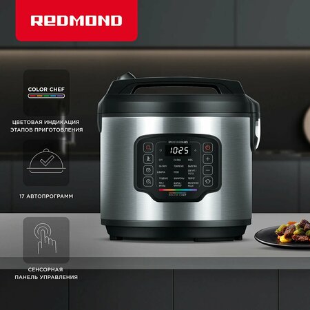 Мультиварка редмонд MC108 станет незаменимым помощником для тех, кто ценит свое время. Выбирайте одну из 17 автоматических программ или задавайте свои параметры готовки благодаря программе мультиповар: решение остается за вами. Устройство оснащено цветовой индикацией этапов приготовления — пользоваться будет комфортно. В комплекте идет чаша с японским антипригарным покрытием DAIKIN®. Цветовой индикатор Следить за готовкой стало просто как никогда. Вам не нужно нажимать множество кнопок, без конца открывать мультиварку, чтобы узнать о состоянии блюда. Эта информация отобразится на шкале Color Chef. По цвету вы поймете, что именно делает прибор: нагревается, готовит продукты, перешел в режим автоподогрева или находится в состоянии отложенного старта. Теперь можно смело включать мультиварку и заниматься своими делами не боясь, что блюдо подгорит. 17 автоматических программ Устройство станет настоящей находкой для пожилых людей и тех, кто не дружит с техникой или хочет упростить процесс готовки. Редмонд MC108 проста в обращении: просто выберите подходящую программу, а остальное мультиварка сделает за вас. Вы можете не только готовить суп, крупы или макароны, но также экспериментировать с блюдами на пару или во фритюре, йогуртом и творогом. Прибор оснащен программой «Су-вид». Теперь готовить в вакууме можно и дома. Сенсорное управление Превратите настройку мультиварки в увлекательное приключение благодаря сенсорной панели управления. Она приятна на ощупь и интуитивно понятна: достаточно лишь нескольких касаний, чтобы установить нужный режим. Кроме того, сенсорные кнопки устойчивы к влаге и легко очищаются при помощи салфетки. Программа мультиповар Нет подходящего автоматического режима? Не беда. Выставите нужную температуру и время благодаря программе мультиповар. Теперь можно создать любимое блюдо вне зависимости от того, есть ли его рецепт в кулинарной книге или нет. Готовьте карамель, соусы и удивляйте гостей изысканными ужинами. Покрытие DAIKIN® Чаша мультиварки оснащена антипригарным японским покрытием DAIKIN®. Она изготовлена из прочного материала, который с легкостью выдержит резкие перепады температуры и воздействие кислот, содержащихся в продуктах. Не бойтесь кулинарных экспериментов, они не приведут к поломке. Также покрытие исключает пригорание продуктов и позволяет готовить практически без использования масла: блюда получаются диетическими. Мыть чашу можно любым неабразивным моющим средством, а также в посудомойке. Разогрев блюд Устройство способно стать не только компактной заменой плиты, но и микроволновки. Мультиварка с легкостью разогреет уже готовое блюдо. Устройство подойдет владельцу небольшой кухни, где каждый лишний сантиметр на вес золота. Если нужно, чтобы приготовленное блюдо оставалось теплым, — это не проблема. Прибор также оснащен автоподогревом. Профессионал на вашей кухне!