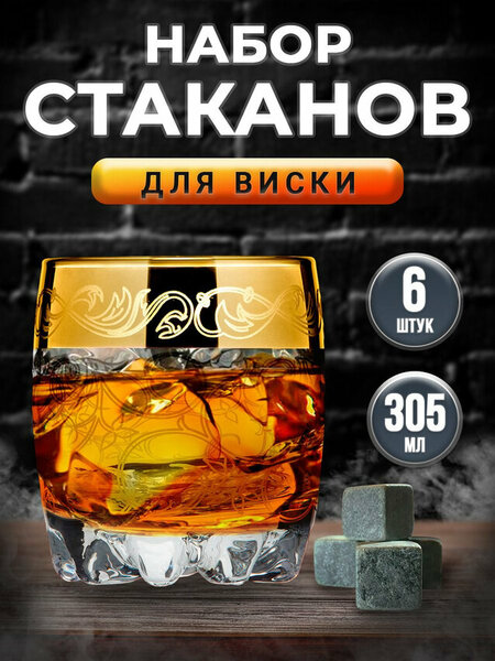 Подарочный набор стаканов 6 шт стаканов, выполненных из декорированного высококачественного стекла. Посуда подарочная - изящные изделия прекрасно дополнят сервировку любого стола и станут эффектным аксессуаром в вашем баре. Стаканы стекло выполнены из прочного стекла с применением новейших технологий, благодаря чему бокалы долго служат и не теряют своего потрясающего внешнего вида в течение всего срока эксплуатации. Этот элегантный, классический набор прекрасно подходит для виски и других крепких напитков, ведь именно в такой посуде раскрываются все нюансы не только основного букета, но и послевкусия. В наборе: 6 стаканов для виски по 305 мл.