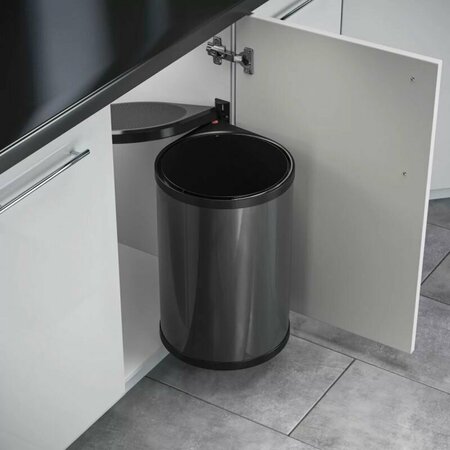 Встраиваемое ведро для мусора 20 литров Hailo Mono, цилиндрической формы со стационарной крышкой, основной корпус из нержавеющей стали цвета антрацит, крышка и механизм открывания из черного пластика. Ведро открывается синхронно с фасадом. Не нужно прикасаться к ведру, для того, чтобы положить в него мусор. При закрывании дверцы, ведро возвращается в нишу, крышка плотно прикрывает его. Педаль для ножного открывания (комплектуется дополнительно) добавит комфорта. Внутреннее ведро с ручкой легко вынимается, его можно использовать при уборке. Система крепится только на одну из боковин, поэтому оставшееся пространство в шкафу можно использовать под бутылочницу, складную лестницу, систему Carry и прочее.