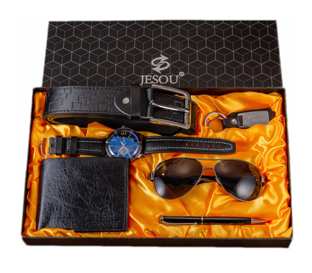 кварцевые часы с большим циферблатом, бумажник из качественной премиальной эко-кожи, ремень из качественной премиальной эко-кожи, брелок для ключей из нержавеющей стали, солнцезащитные очки, подарочная ручка.