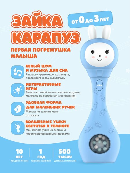 Я Зайка-Карапуз® alilo стану первой и любимой игрушкой малыша! Со мной можно играть как с обычной погремушкой, а можно включить и услышать много разных звуков, весёлых мелодий или сладко поспать под спокойную музыку или белый шум. ⭐️Я знаю 9 звуков окружающего мира, потряси меня, чтобы услышать новый звук. ⭐️ Игра на барабанах. Тряси меня и создавай свой первый барабанный бит, я знаю 5 разных звуков барабана. ⭐️ Игра на пианино. Послушай, как звучат ноты, и сыграй свою мелодию на пианино. ⭐️ Маракасы. Я знаю 5 ритмичных мелодий. Потряси меня в ритме мелодии, и она зазвучит по-новому. ⭐️ Весёлые мелодии. Давай развлекаться – я сыграю тебе 15 разных весёлых мелодий. ⭐️ Мелодии для сна. Уже пора спать? Включай 15 спокойных мелодий, которые помогут расслабиться и подготовиться ко сну. ⭐️ Белый шум. А ещё у меня записано 20 минут белого шума – он поможет заснуть и спать сладко-сладко. Мои мягкие ушки сделаны из безопасного силикона и переливаются разными цветами в темноте. Я совсем не боюсь падать, ведь сделан из суперпрочного ABS-пластика, который в 30 раз прочнее обычного. Работаю от батареек, входят в комплект. Гарантия 1 год.