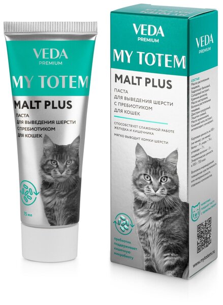 Для выведения шерсти из желудка кошки. MALT PLUS — способствует нормальной работе желудка и кишечника за счёт освобождения: - от комков вылизанной шерсти, - непереваренных частиц корма, - проглоченных несъедобных предметов. Паста обволакивает их, размягчает и безболезненно выводит естественным образом. Ветеринары рекомендуют malt пасту для кошек как обязательное средство при линьке. Кошкам и котам длинношерстных пород, а также склонным к проблеме плохого освобождения от вылизанной шерсти, рекомендуется систематическое употребление этого средства. MALT PLUS содержит растворимую клетчатку Декстрин, чем выгодно отличается от других мальт паст. Клетчатка стимулирует сокращение кишечника (перистальтику) и помогает выводу шерстяных комков и других инородных тел. Декстрин наделяет пасту пребиотическими свойствами: - Активизирует рост и развитие пробиотических бактерий. - Улучшает состояние кишечной микробиоты. - Помогает наладить работу кишечника. - Функциональный корм MALT PLUS предназначен для кошек и котят, подходит для хорьков. - Отличный вкус — кошки и хорьки едят эту мальт пасту с удовольствием! Рекомендуется применять: - в период сезонной линьки — увеличенная порция, - в целях профилактики для предотвращения скопления шерсти в желудке — ежедневно.