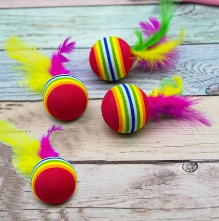 Мяч с перьями диаметр 3,5 см, набор из 4-х штук; Игрушка для кошек, Радужный мяч с перьями
