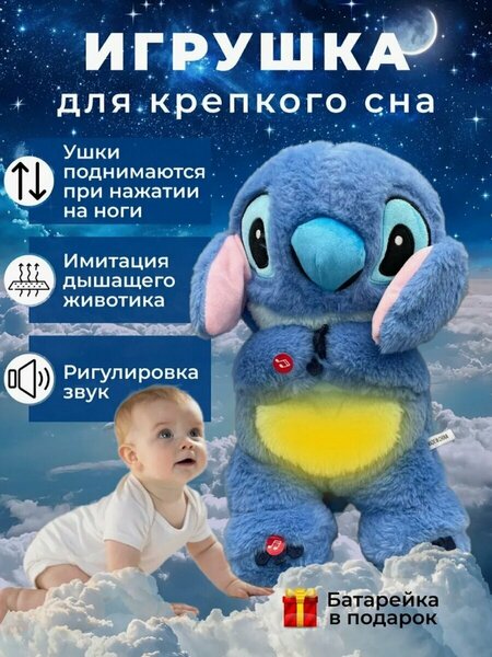 Мягкая игрушка BABYLIGHT Стич, для сна, со светом и звуком, дышащая, плюшевая, 35 см