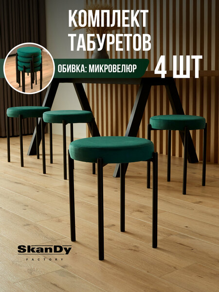 Комплект из 4шт идеально подойдет для вашей кухни как оригинальный предмет мебели для дома. Наши табуретки универсальной круглой формы украсят обеденную зону, квартиры, дачи или даже офиса. Благодаря своему компактному размеру, и небольшому весу (5кг.) они помещаются в любую комнату, не занимая много места их легко составить друг на друга, что делает набор легким в использовании и хранении. Высококачественные материалы нашего табурета: Микровелюр - износостойкая ткань, обеспечивает долговечность и простоту ухода методом сухой чистки. Наполнитель - высокий поролон предоставляет максимальный комфорт и поддержку. Красивая обивка и прочный каркас придают не только удобство, но и стиль в декоре. Цельносварное основание стула выдерживает нагрузку до 120кг. Металл стенка 1,2мм, окрашен порошковой краской матовой текстуры. Простая сборка - необходимо только прикрепить сидушку к железному основанию. Стальные ножки оснащены подпятниками и защитят напольное покрытие от повреждений. Эргономичная высота удобна для стандартного кухонного стола. Табурет подойдет для прихожей, коридора, гостиной или для балкона, лоджии. Он создаст уютную обстановку у туалетного столика. Широкая цветовая гамма сочетания рам и сидений позволяет использовать в различных дизайнах интерьера: скандинавский, лофт, минимализм.